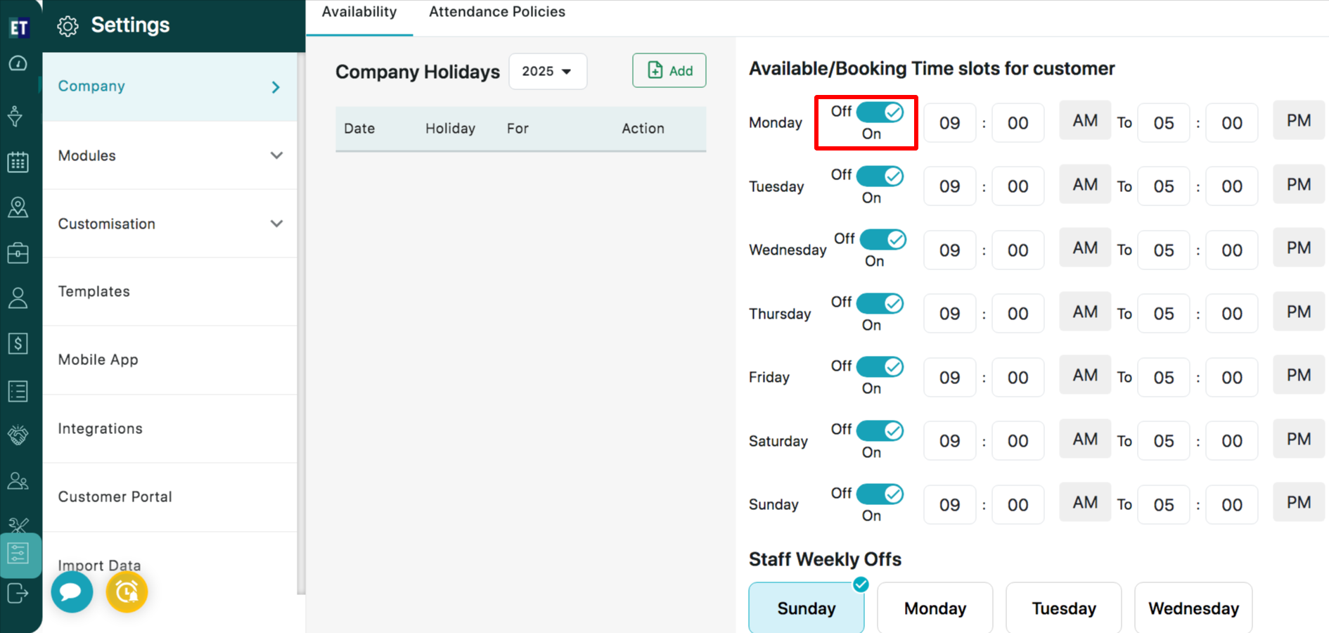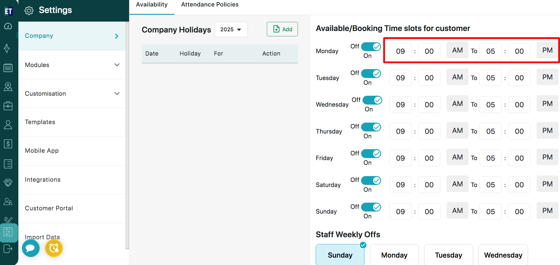 How can I manage Booking Availability/Time Slot and Company Holiday?