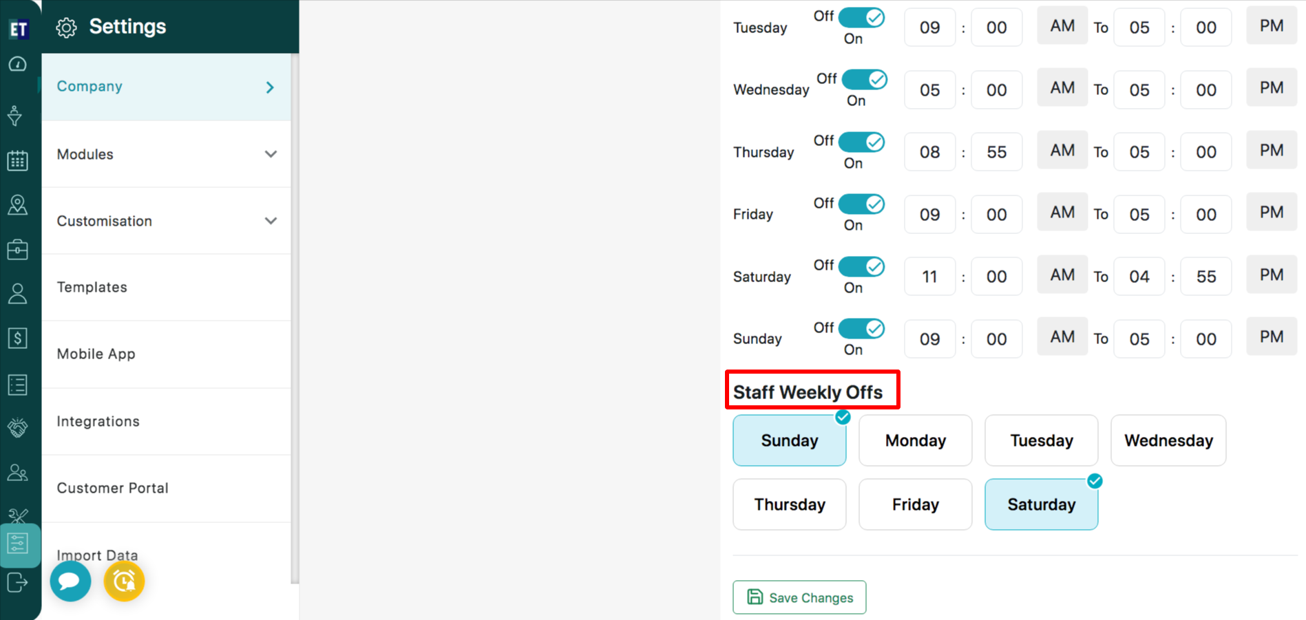 You can also set the weekly off for staff by selecting the week days from the “Staff Weekly Offs” section.