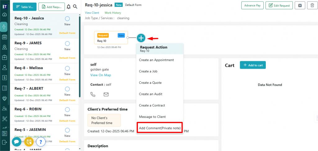 After selecting Request, a new window will open where you will find the “+” icon available in the Timeline view. On clicking “+” sign, a dropdown list will appear, then click on Add Comment(Private note).