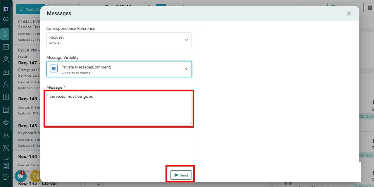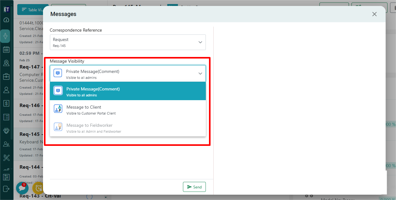 On clicking Add Comment(Private note), a pop window will appear. In the message visibility window, you can select to whom the message/comment will be visible and you can select between two options - 1) Private Message(Comment) Visible to all admins 2) Message to Client Visible to Customer Portal Client.