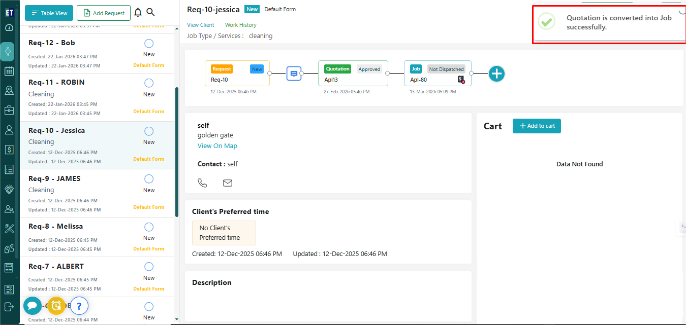 Select the first radio button and click on the “OK” tab will convert the selected quote into a job and show you a success alert.