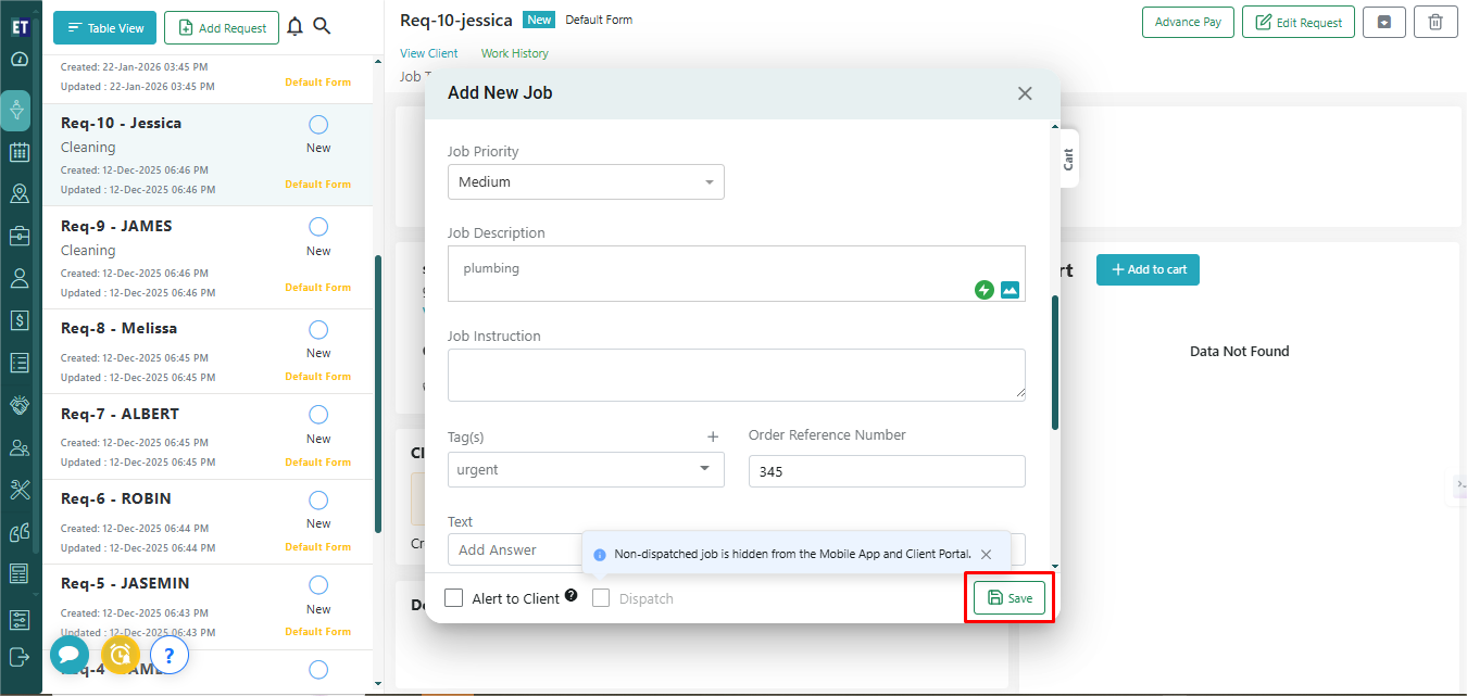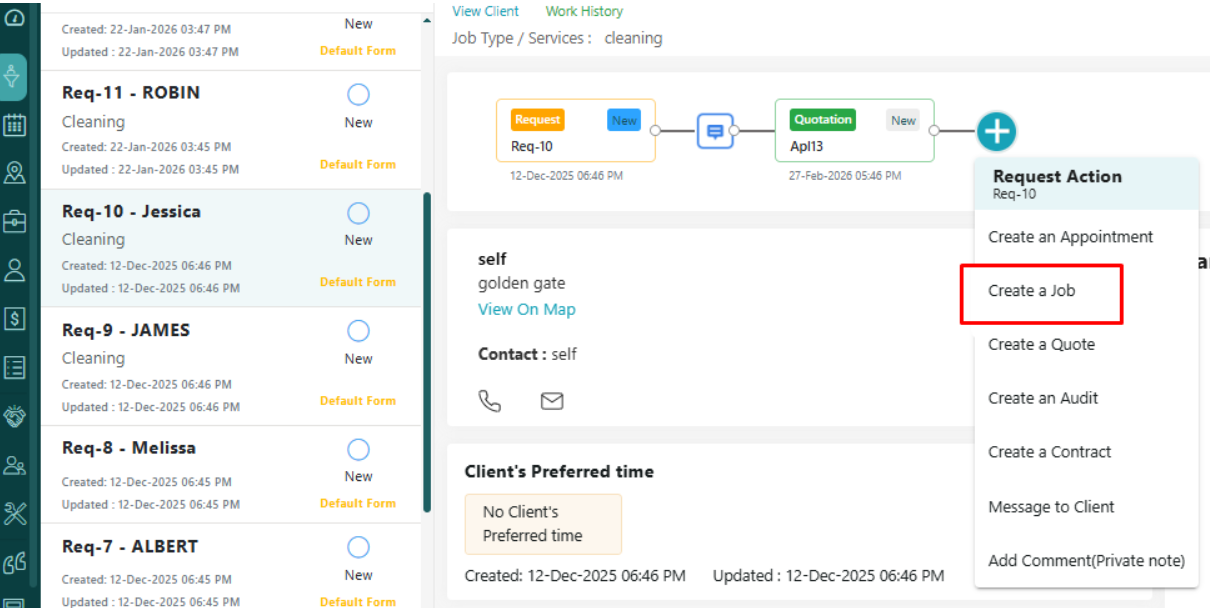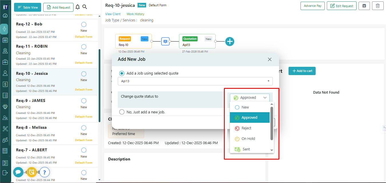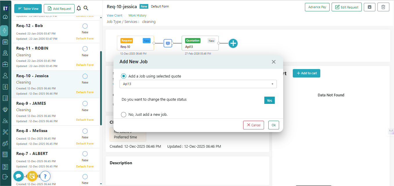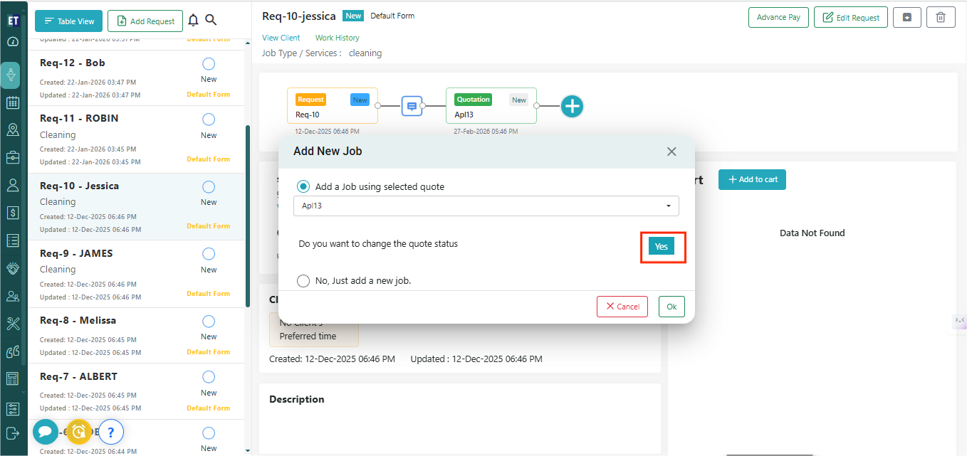 Now you will see Add New Job pop having two radio buttons i) Add a Job using selected quote ii) No, Just add a new job. Select first If you want to convert the added Quote into a new job. Select second if you want to just add a new job.