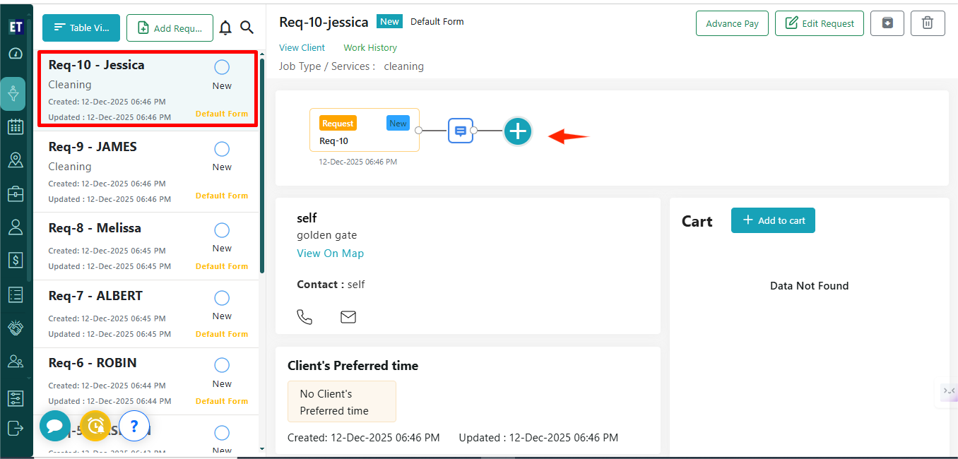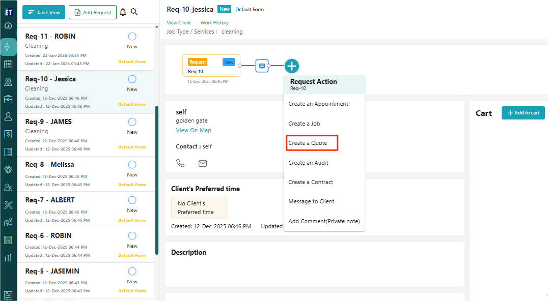 Select the request in which you want to create a quote. To create a Quote, click on the “+” present within the Timeline view.