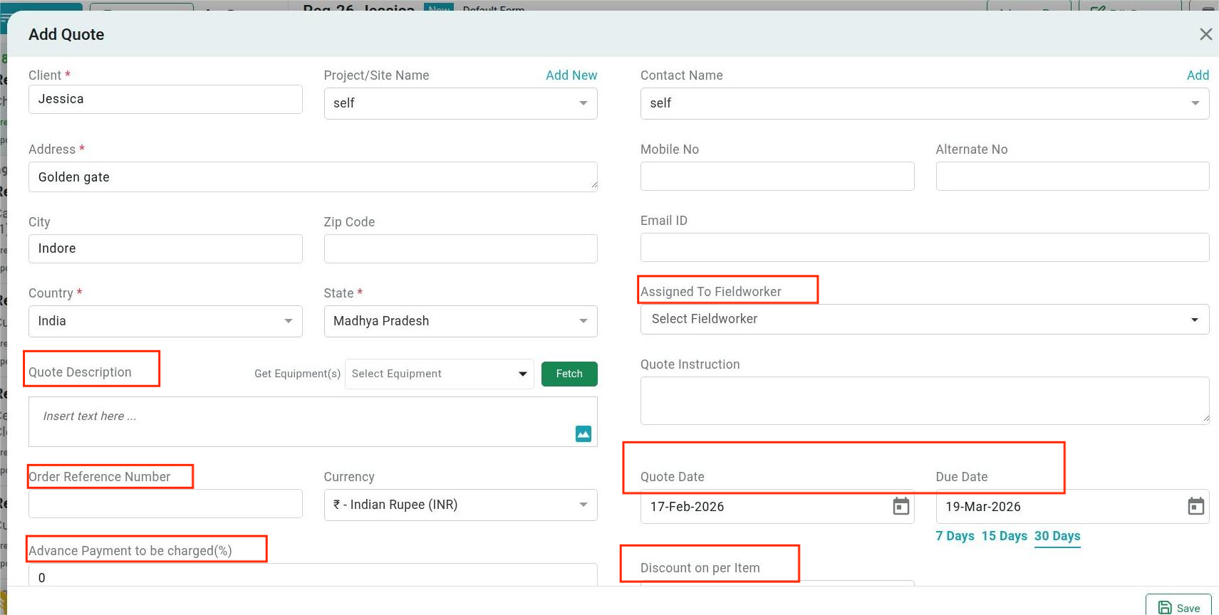 After selecting Create a Quote option, you will see the “ Add Quote” popup with the pre-filled providers details, you need to fill Quote description, Quote instruction, Order Reference Number, Assigned To Fieldworker, Quote date, Quote Due date, and Discount per Item.