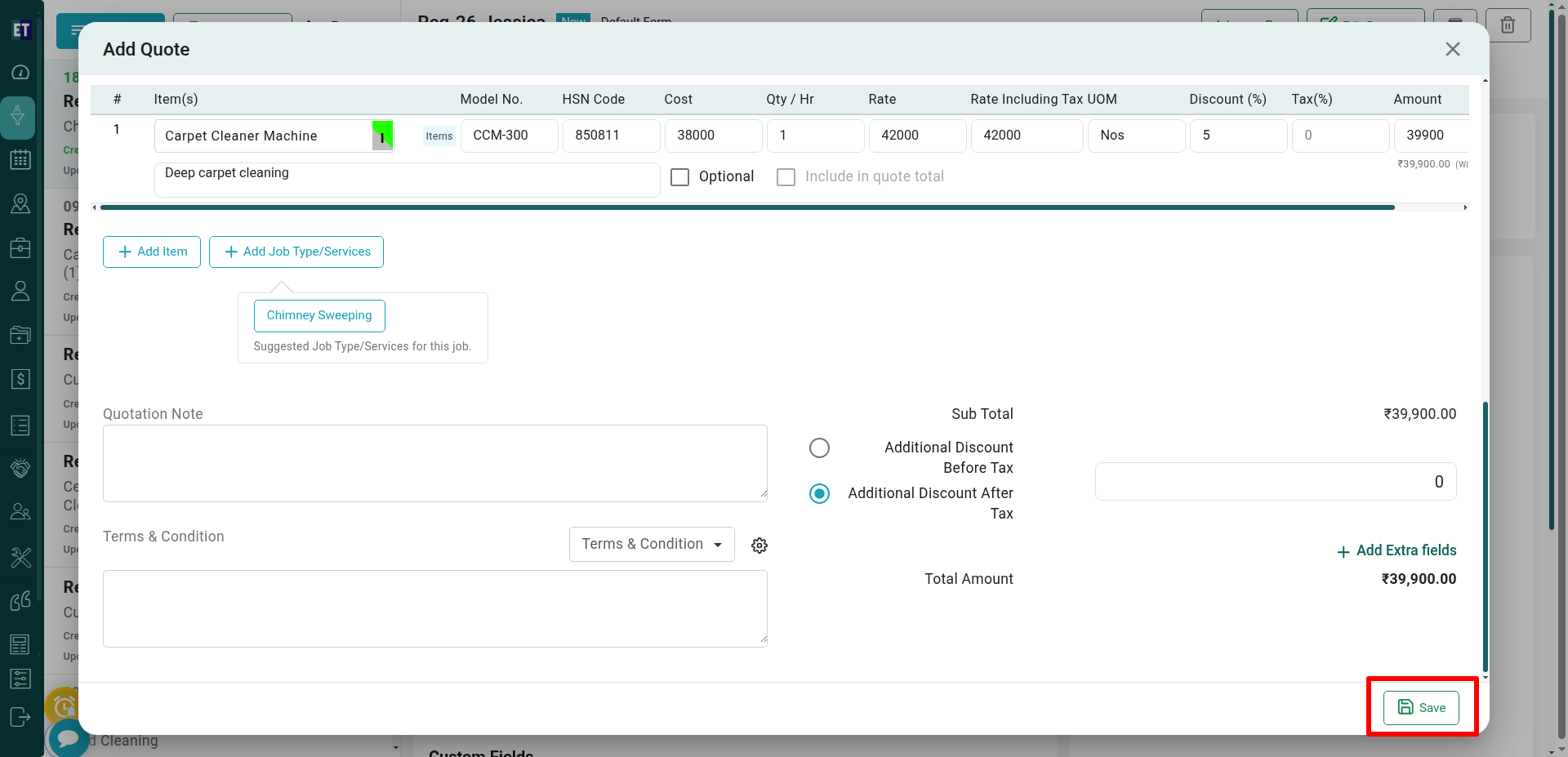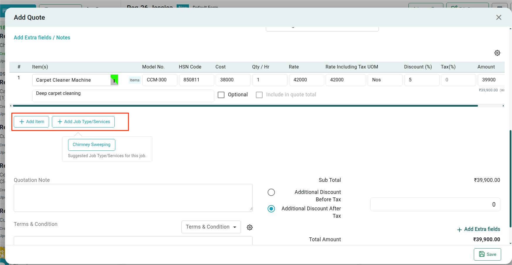 Also Add Item or Add Job Type/ Services, Rate, Quantity/Hr, Discount to raise the quotation.