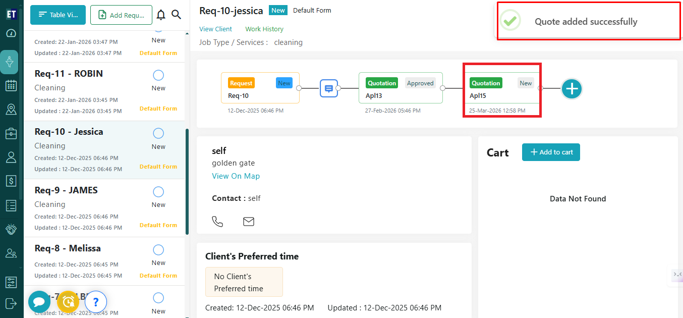 Clicking on the Save button will show you the success alert on the right corner of the screen and the newly added Quote will be displayed in the timeline view.