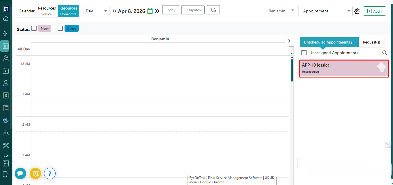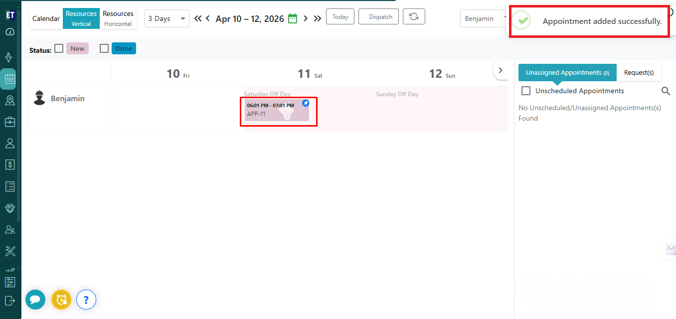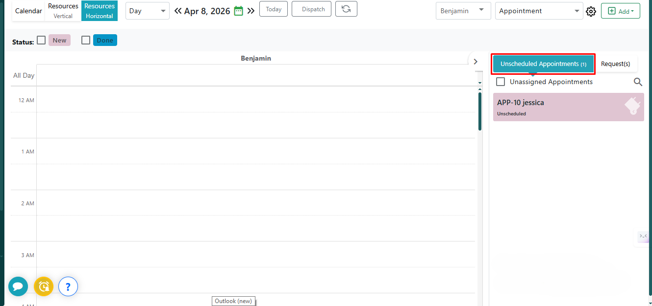 On the right panel, click on “Unscheduled Appointments”. The list will display all pending appointments (e.g., APP-10 Jessica).