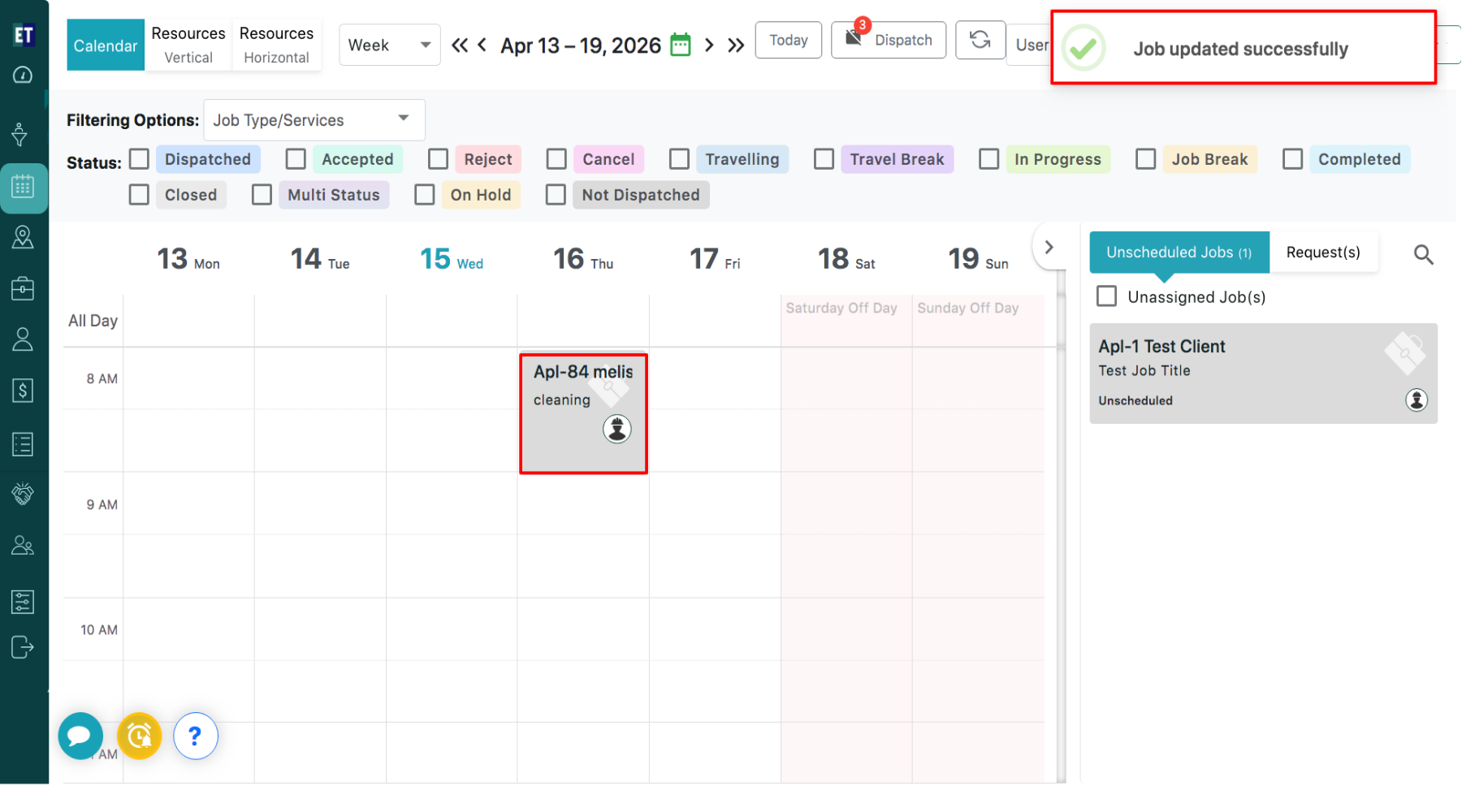 As soon as you drop the job to the selected date, you will get a success alert popup “Job updated successfully” at the right corner of the screen and the job will be displayed in the calendar view.