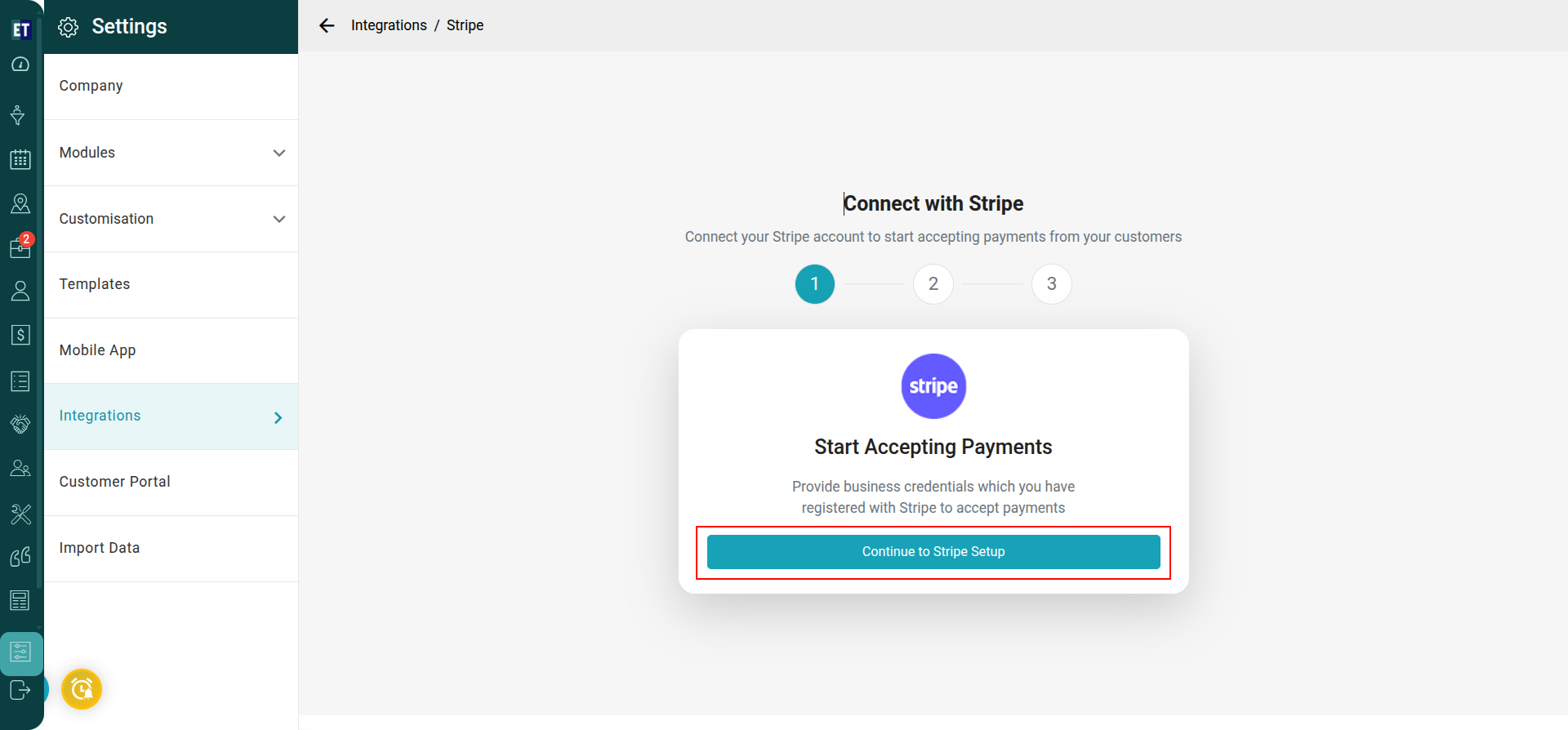 After selecting the Stripe Integration option, you will find steps for integration with Stripe. Then click on “Continue to stripe setup”.
