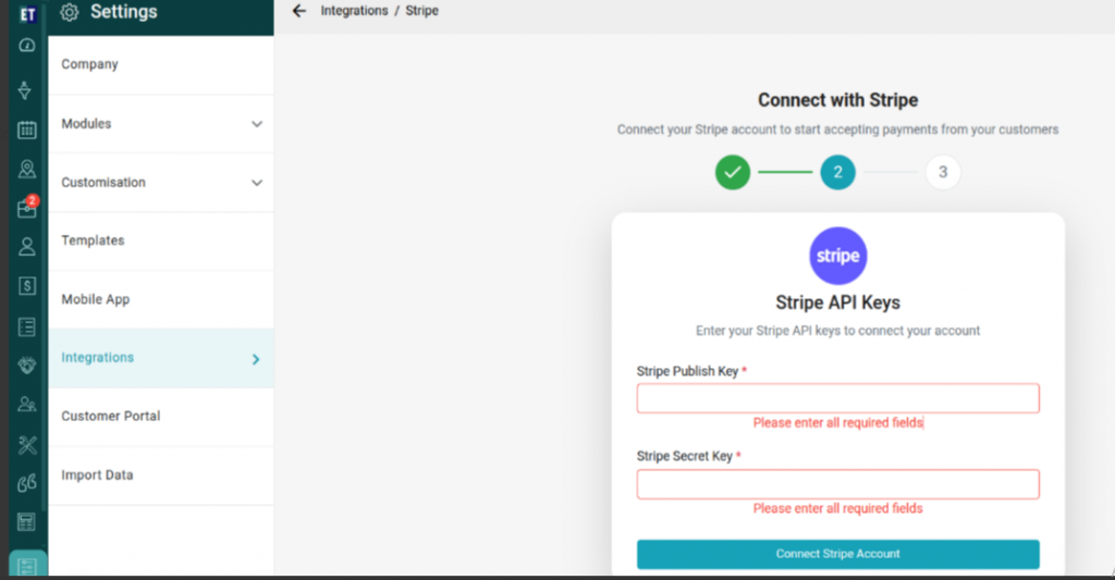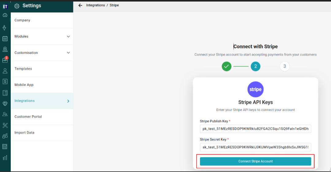 Once the user gets the Publish Key and Stripe Key, fill those keys on EyeOnTask’s Stripe Integration 2nd step and then Click the “Connect Stripe Account”.