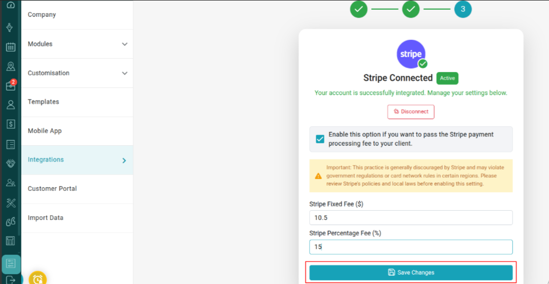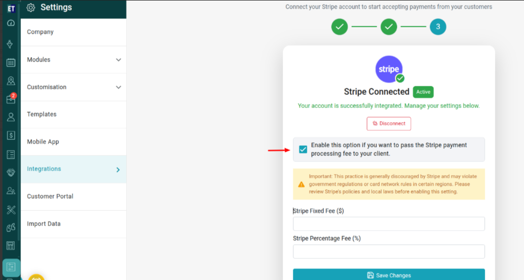 Now in the 3rd step, If you want to charge the Stripe payment processing fee to your client, check the box “Enable this option if you want to pass the Stripe payment processing fee to your client.”